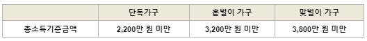 - 배우자가 없는 단독가구는 2,200만 원 미만의 소득요건이 충족되어야 합니다.